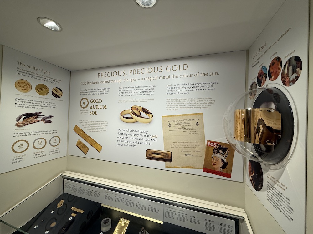 銀行の歴史だけでなく、イギリスがキャッシュレスに移行していった歴史や、通貨・お札の製造方法、お札に隠された偽造防止の細工、銀行で取り扱う金の延べ棒の保管方法など、幅広い展示があり、子ども用にもわかりやすい説明もありますので、大人も子どもも楽しめる施設となっています。
